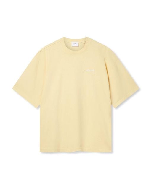 The Axel Arigato Honour Washed T-Shirt offers a unique vintage look with its old-dye technique and distinctive `Arigato` embroidery. This oversized tee is perfect for those seeking a casual yet stylish addition to their wardrobe. Key attributes: Vanilla Yellow | Yellow | Cotton | Oversized fit | Old-dye technique | Arigato embroidery with loose threads | Dimensions & fit: Oversized fit | Composition & care: Cotton | Wash with similar colours. Avoid spot cleaning to prevent localized fading. Be cautious of colour transfer to light garments. Colour: yellow