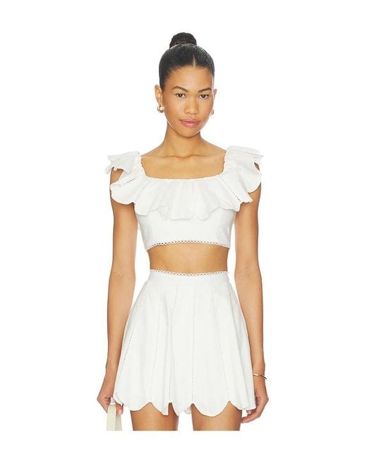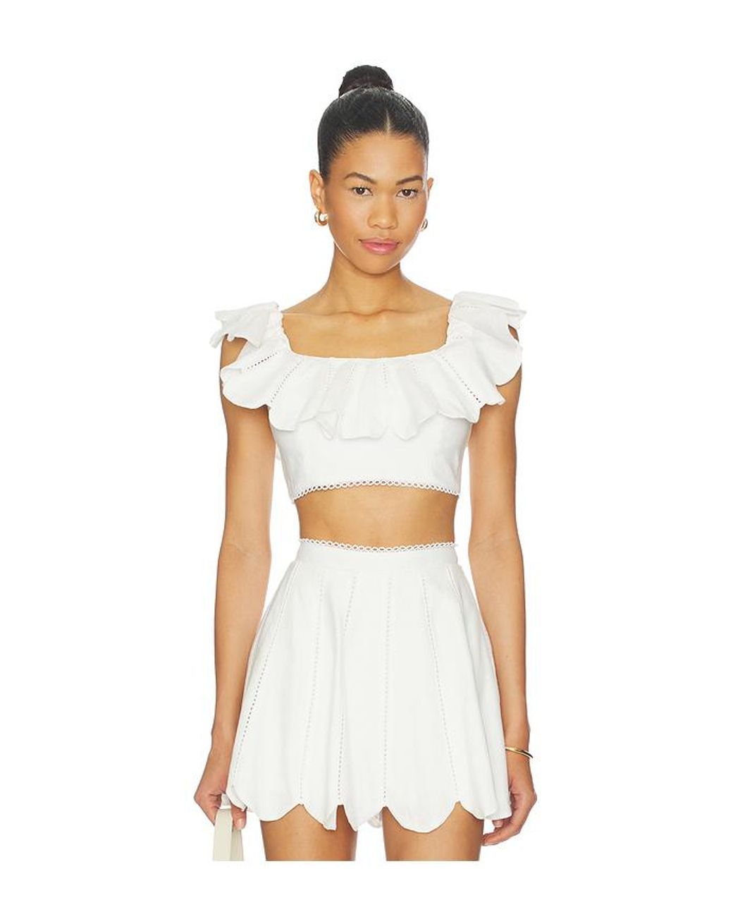 AZULU Nela Top in Ivory. Size L. Also in XXS, XS, S, M, XL. AZULU Nela Top in Ivory. Size XXS, XS, S, M, XL. Self: 100% linen Lining: 100% viscose. Dry clean only. Back zip closure. Ruffle neckline trim. Scalloped detailing. Cropped fit. Midweight linen fabric. Item not sold as a set. AULU-WS26. SS2610.