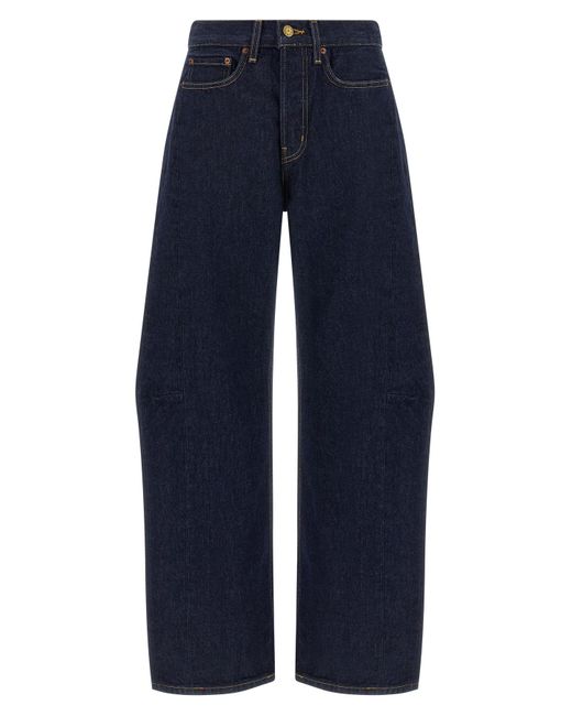 Slim Lasso' double-sided Japanese denim jeans with contrast stitching, slightly curved wide leg, side pin tucks, front button closure, five pockets, back logo tag. Composition: 100% cotton. Size&Fit: slouchy fit.