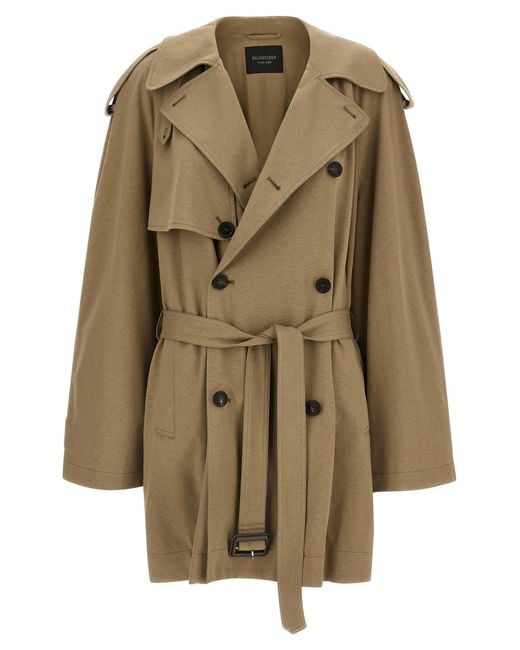 Double-breasted short mélange light cotton trench coat with front button closure, lapel collar, pockets, long sleeves, cape and back split, and removable belt. Composition: 100% cotton Colour: natural