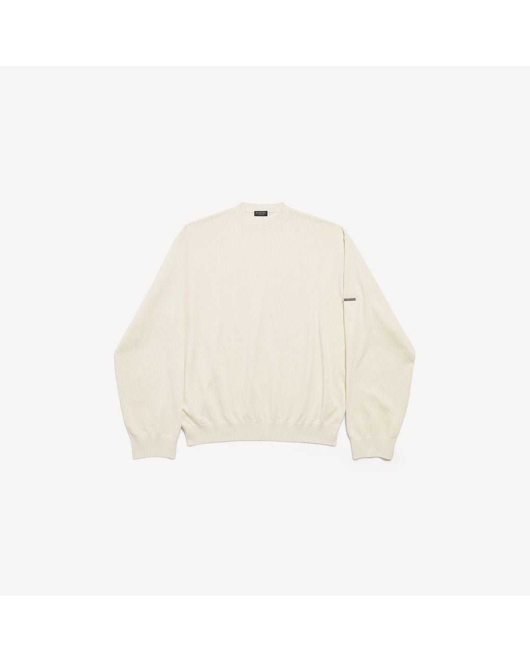 Crewneck jumper in cream classic cashmere knit for womengarde-robe is made up of wardrobe staples in elevated cuts, sharp finishing, and luxe materials without any branding other than bold silhouettes and precise tailoring with minimalist construction techniques. Cashmere knit• crewneck• dropped shoulders• long sleeves• ribbed trims• balenciaga metallic plate on left sleeve• made in italy. Main material: 100% cashmere. Colour: natural