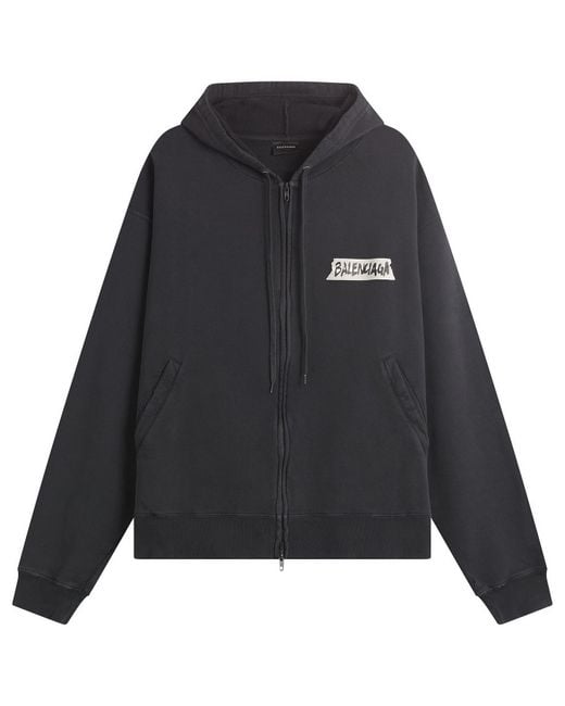 Balenciaga Masking Tape jersey zip up takes the classic hoodie and pushes it into rough‑edged, industrial territory. It’s made from dry fleece — a structured, matte knit that feels substantial and holds its shape — then finished with worn‑out and distressed details for that grungy, lived‑in effect. A drawstring hood and two hand pockets keep the familiar hoodie DNA intact. Masking‑tape artwork across the front and back brings the collection’s DIY graphic attitude into a heavier, street‑leaning layer. 100% Cotton, Oversized Fit, Distressed Details, Drawstring Hood, Dropped Shoulders, 2-Way Zip Closure, Masking Tape Branding, Made in Portugal, Style Code: 850338-TTVL7-1041, Shop All Men's Balenciaga Hoodies, Shop All Men's Hoodies, - Balenciaga Men's Masking Tape Jersey Zip Up Faded Washed Black