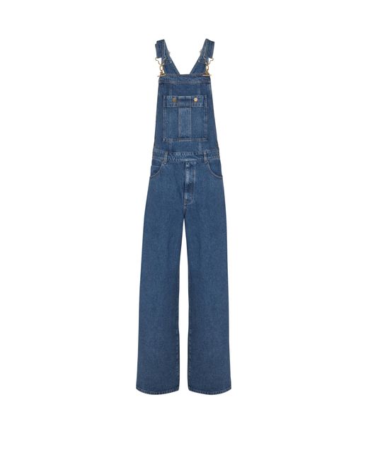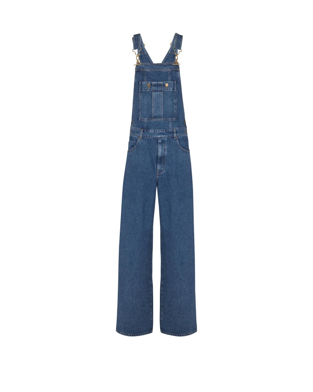 Five-pocket dungarees in dark blue denimAdjustable straps with T-Bar fasteningsPatch front pocket with round gold engraved "PB Balmain" buttonsBelt loops at the waist and zip flySide button fasteningLeather Balmain Paris patch and PB embroidery on the backStraight cutModel measures 190cm and wears a size 30Main material: 100% cottonMade in ItalyItem: GH1MQ010DG08 Colour: blue