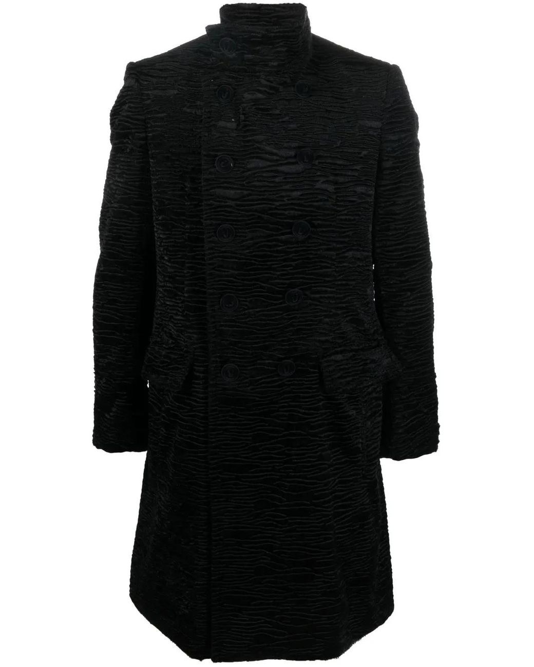 Jet black cloqué effect high neck double-breasted button fastening long sleeves two side flap pockets central rear vent mid-length Size: 48. Gender: Male. Material:Polyamide/Polyester/Acetate/Cotton/Cotton/Cupro. Colour: black