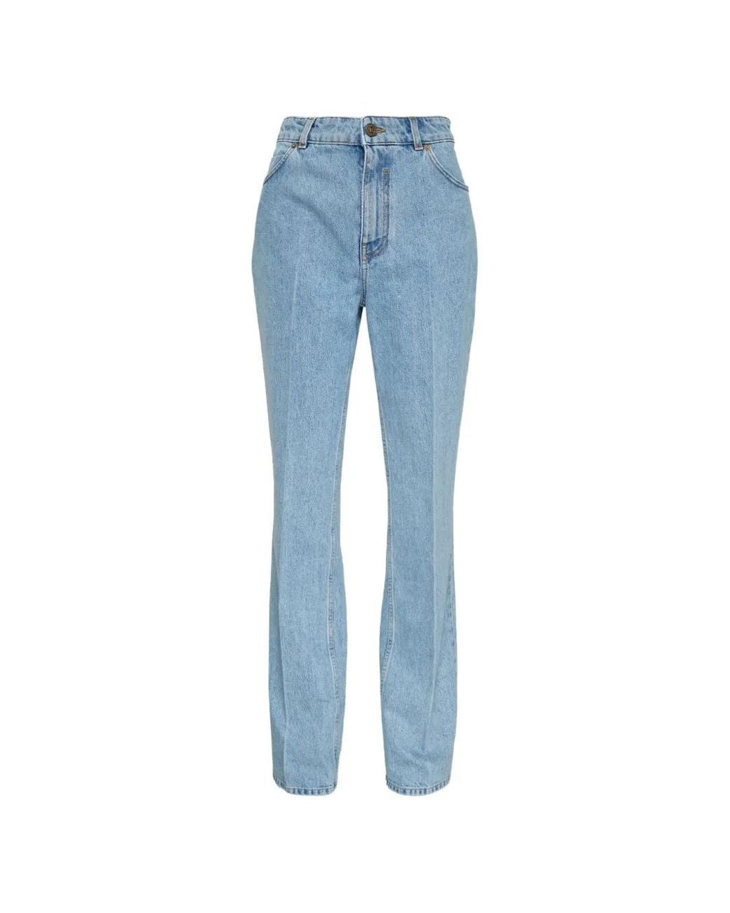 Blue pressed crease belt loops front button and zip fastening classic five pockets logo patch to the rear gold-tone hardware Size: 38. Gender: Female. Material:Organic Cotton/Polyester/Organic Cotton.