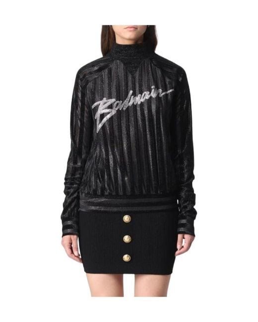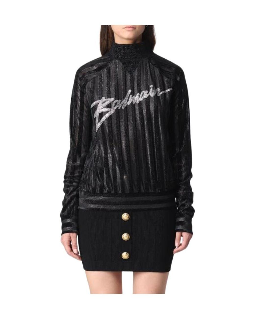 Logo embellishment, rhinestones decoration, rolled collar, long sleeves, straight hem. Colour: black