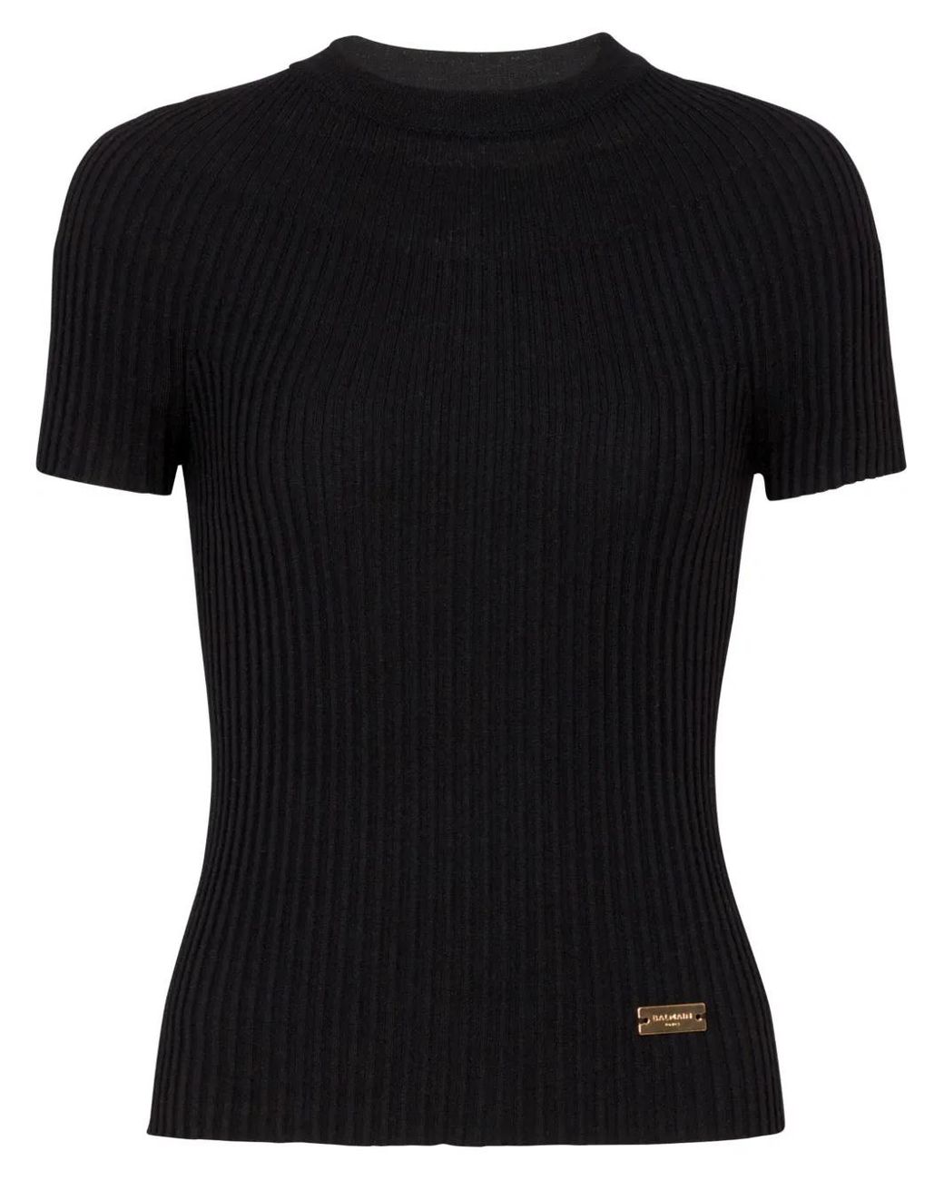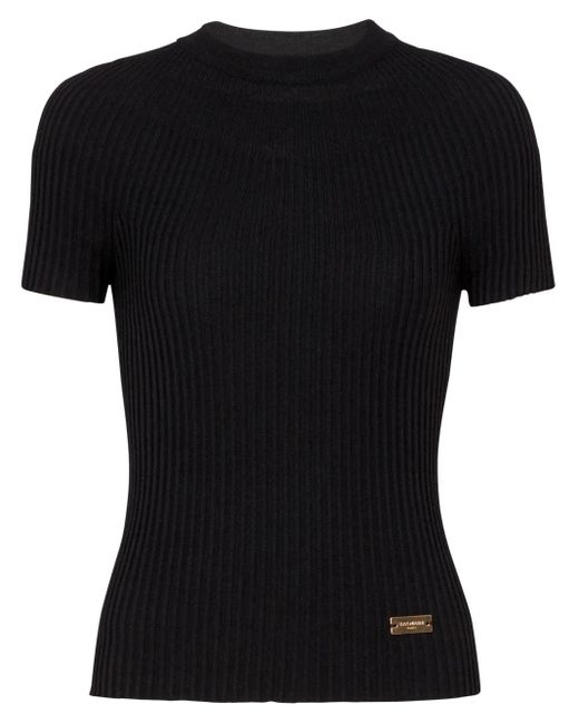 Black virgin wool ribbed knit gold-tone logo plaque crew neck short sleeves straight hem Size: 36. Gender: Female. Material:Virgin Wool. Colour: black