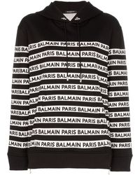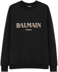 Balmain's sweatshirt is proof that the logomania trend is still going strong and showing no signs of stopping. Cut from soft cotton-jersey for a slim fit, it's emblazoned with the label's iconic motif in white lettering and has ribbed edges. Wear yours with cropped pants and monochrome mules or sneakers. Fits true to size, take your normal size. Intended for a slim fit. Mid-weight, slightly stretchy fabric. Model is 175cm/ 5'9" and is wearing a fr 36.