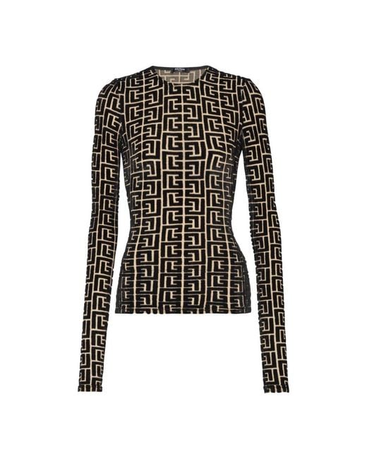 Balmain Monogrammed velvet top is a fitted velvet blouse featuring a visible back zip with a Balmain Paris-engraved slider. Designed for polished day-to-night looks, it pairs tailored bottoms or layered evening outfits. Key attributes: Black | Viscose | Visible zip fastening on the back | Balmain Paris-engraved slider | Monogrammed velvet | Round neck | Long sleeves | Dimensions & fit: Fitted cut | Model measures 180 cm and wears a size 1 | Composition & care: 88% viscose | 12% polyester Colour: black
