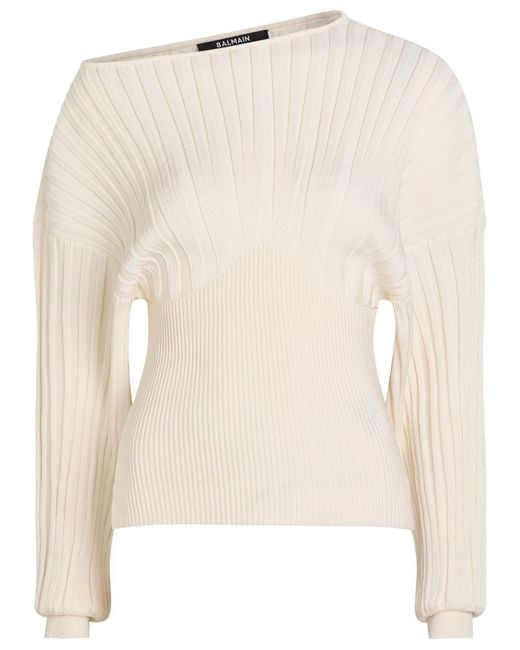 Info & Care Balmain knit top Ribbed, off-the-shoulder wide-neck, dropped shoulders, batwing sleeves Slips on 85% viscose, 15% polyester Dry clean Size & Fit Length shoulder to hem: 23 inches/ 58.5cm Midweight Relaxed style, fitted across the waist; Model is 5'8""/ 173cm and wears a size;FR36 Colour: natural