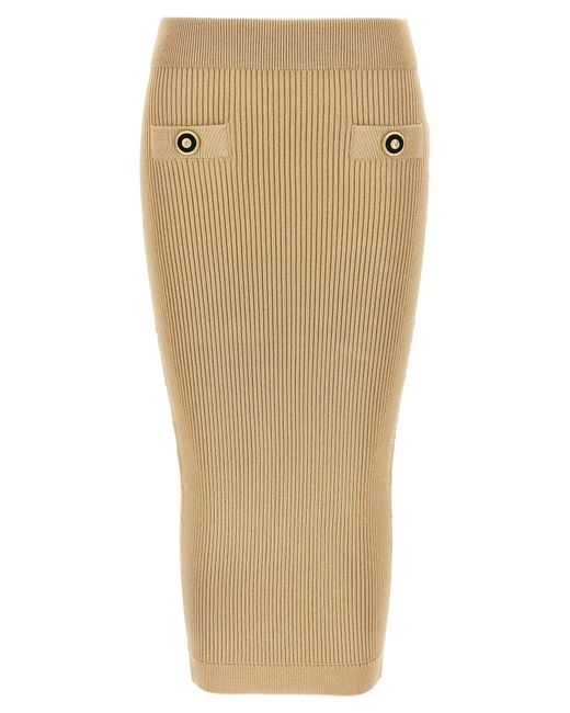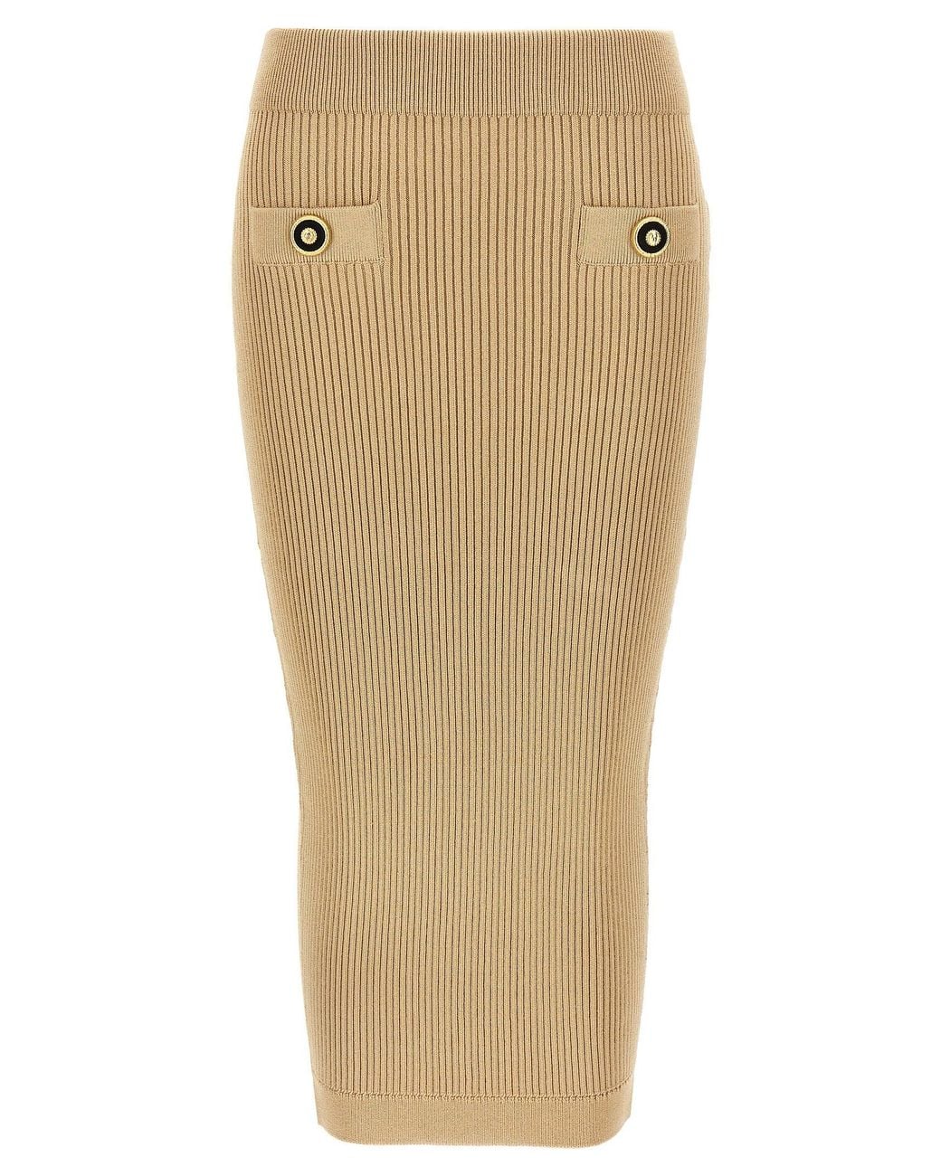 Ribbed knit midi skirt, elastic waistband, trompe-l'œil pockets with front metal 'filo Leone catena', high waist.SpecificationValueBrandBALMAINComposition84% viscose, 16% polyesterMade InItalySize & FitSlim fitFrench sizeColorBeigeGenderWomenSeasonSpring Summer 2025