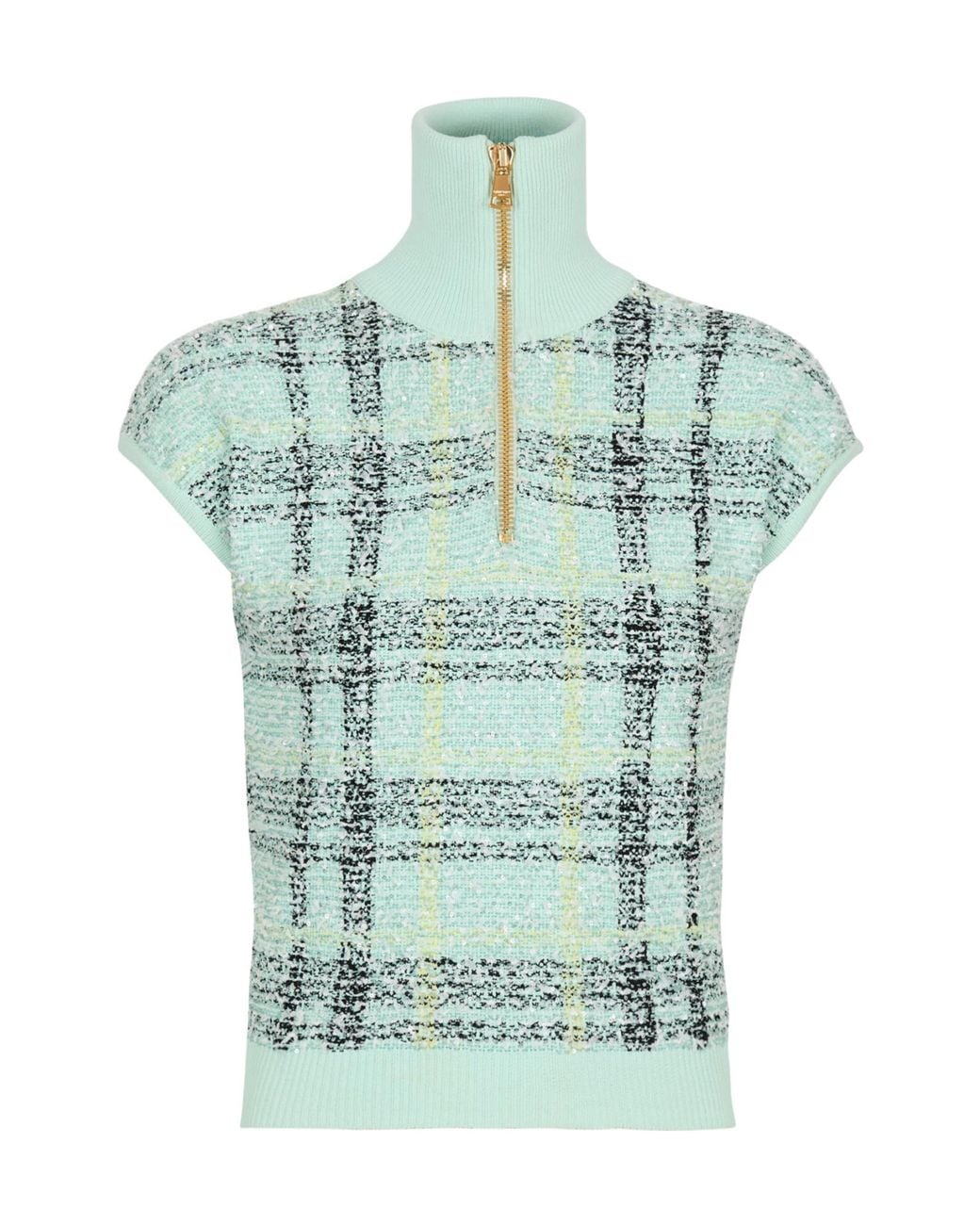 Zipper collar, visible zipper, engraved zipper pull, ribbed edges. Colour: blue