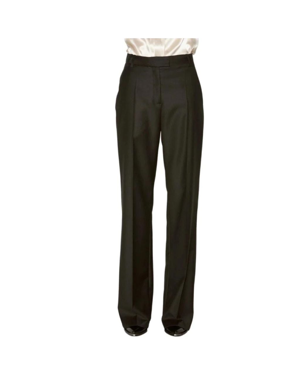 Barbara Bui presents a modern take on masculine tailoring with these high-waisted wide trousers. Crafted from a blend of wool and cashmere, these black gabardine trousers feature a subtle stitched pleat and hidden button closure. The minimalist design is accentuated by the addition of belt loops, allowing you to personalize your look with your favorite belt. Whether paired with a shirt for a slightly boyish office look or a fine knit jumper for a more relaxed vibe, these trousers promise a contemporary silhouette. The model is 1.77m tall with hip, waist, and chest measurements of 88cm, 59cm, and 75cm respectively. She is wearing a French size 38 or a size S. Composition: 95% Wool - 5% Cashmere. Care: Dry clean only. Color: Black. Colour: grey