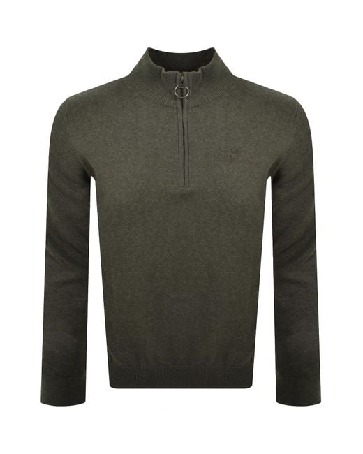 Barbour Half Zip Cotton Knit Jumper In Olive Green. A ribbed stand up collar with a branded half zip fastening featuring a tartan placket on the interior. Ribbed cuffs on the long sleeves and waistband. Ribbed detailing features from the underarm to the waist on the sides. The signature Barbour logo is embroidered on the left of the chest. 100% Cotton. Colour: green