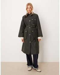 Go to BaltiniModello: LWX1486OL52 MaterialsExterior: 100% waxed cotton. Lining: 65% polyester, 35% cotton. Collar: 100% cotton. Finishes: 100% leather.DesignLong trench inspired by the Solway model from 1960, featuring a corduroy collar, zip and snap button