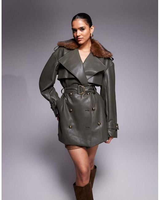 Women's Grey Leather Look Faux Fur Collar Trench Coat