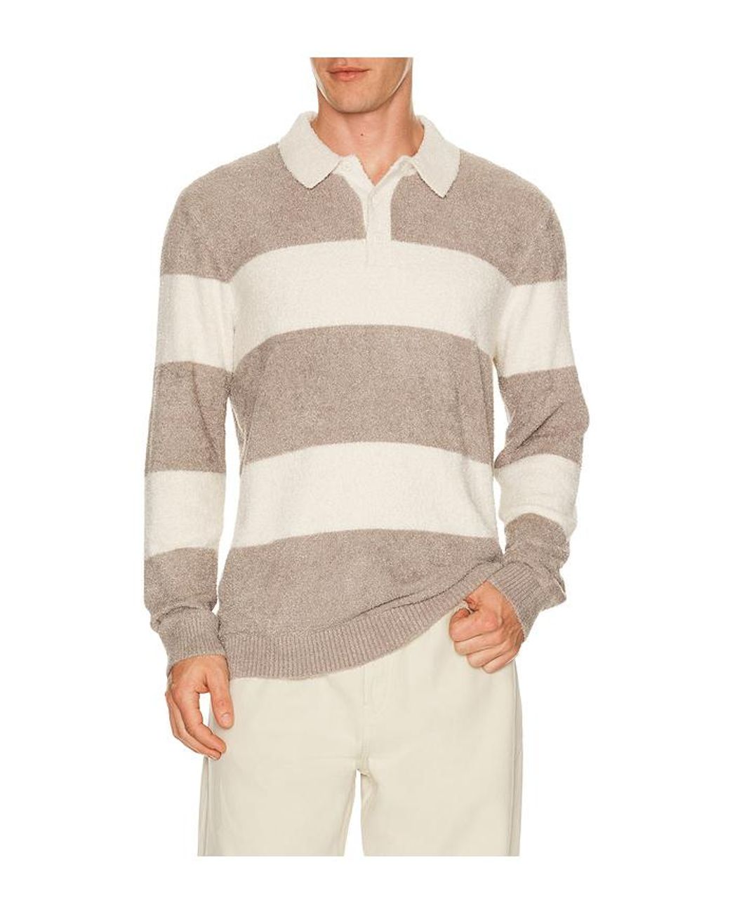 Barefoot Dreams Rugby in Grey,White. Size L. Also in S, M, XL/1X. Barefoot Dreams Rugby in Grey,White. Size S, M, XL/1X. 75% nylon 25% rayon. Machine wash. Front partial button closure. Ribbed trim. Heavyweight knit fabric. BDRE-MS7. BDMCL26538.
