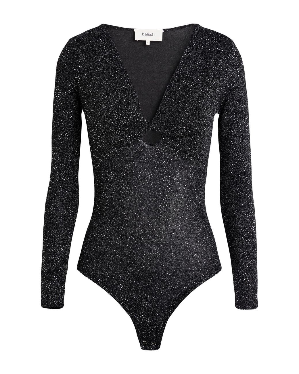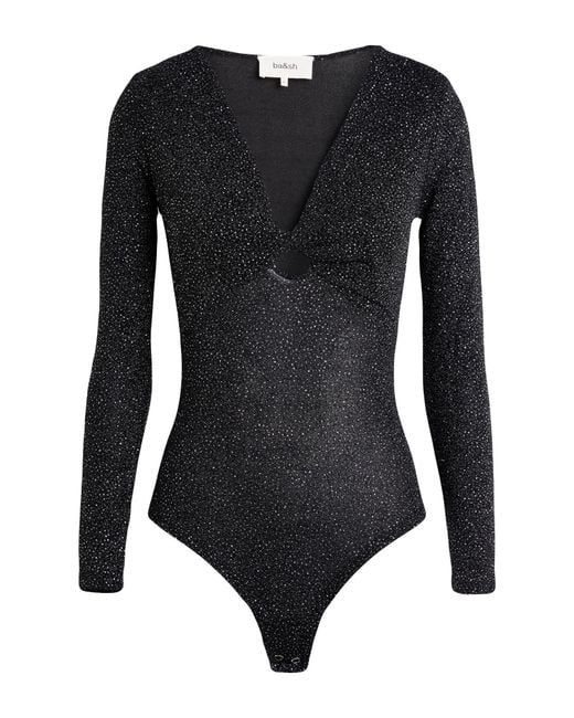 BA&SH. jersey, stretchy fabric, plain colour with appliqués, buckle, v-neck, long sleeves, hand wash, do not bleach, do not tumble dry. 65% Polyamide, 30% Metallic fibre, 5% Elastane. Colour: black
