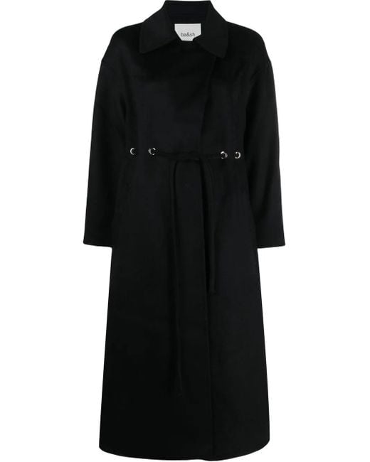 Black wool blend wrap design drawstring waist classic collar long sleeves straight hem mid-calf length Size: XS. Gender: Female. Material:Polyamide/Wool/Polyester. Colour: black