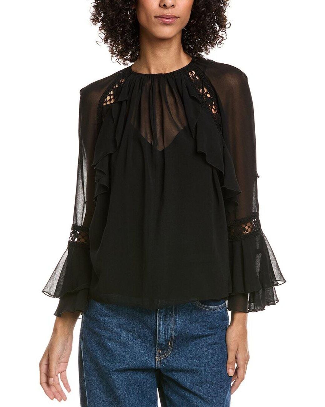 About the brand: Parisian-inspired style that exudes joy. Mena Top in noir with ruffle trim, lace inserts, and bell sleeves Approximately 25in from shoulder to hem Model is 5'9 and is wearing a size 1. Measurements may vary slightly by size. 100% viscose Machine wash Imported Colour: black