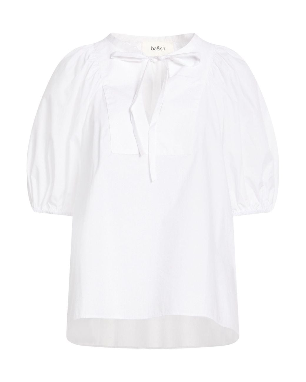 BA&SH. bohemian blouse, woven, plain colour, gathered, lace-up neckline, short sleeves, puffed sleeves, machine wash or dry clean, do not bleach, do not tumble dry. 100% Cotton.