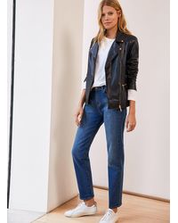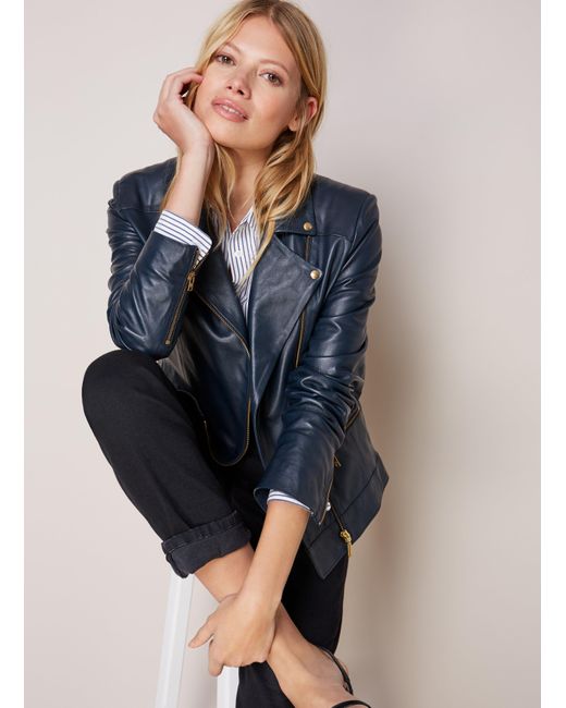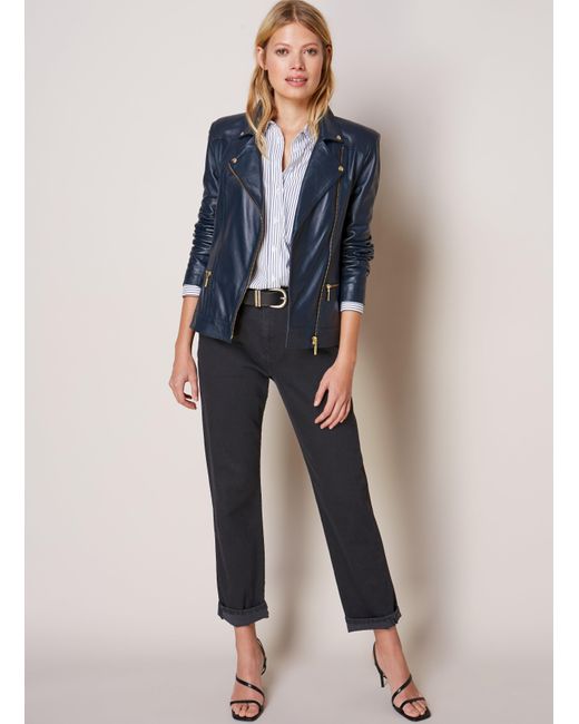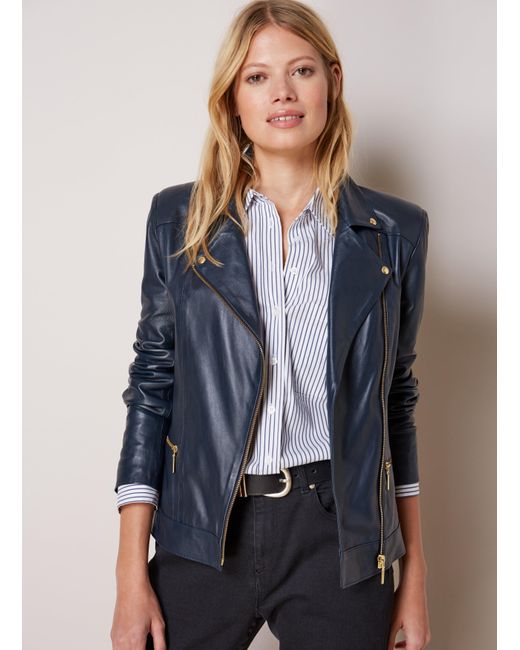 Relaxed fit. For a neater look, we suggest sizing down from your usual size. If you like your leather biker cut slightly longer and looser, then the search ends here. The gold-tone hardware on this premium, butter-soft leather jacket creates an understated elegance and will add a luxe spin to cargo trousers, boyfriend jeans and plain white tees. In super soft european leather, it's a key piece in the modern wardrobe. Baukjen. Crafted in 100% fully lined portuguese leather. Featuring a zip cuff and pocket detail. Gold hardware detailing. Handmade in portugal. 100% leather. Specialist leather dry clean only. Sleeve length - 60cm (23 5/8"). Back shoulder at neck to hem - 52.5cm (20 3/4"). Colour: blue