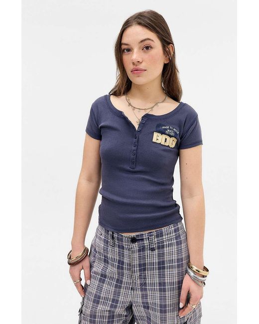 Fitted henley top by BDG with an appliqué logo on the chest. Crafted from soft cotton jersey, complete with a scoop neckline, short button placket and short sleeves. UO exclusive. Colour: blue