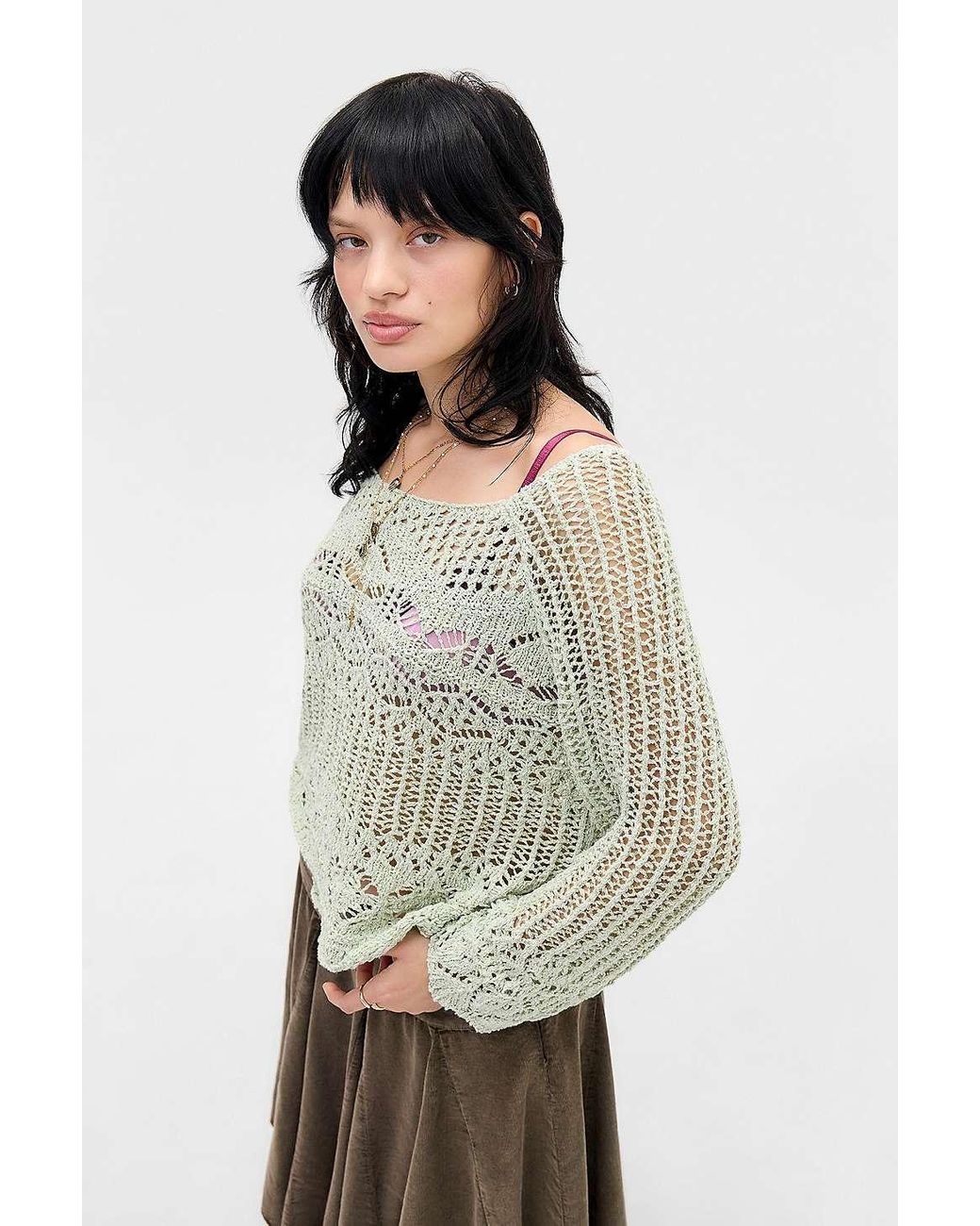 Slouchy open-knit jumper from BDG, perfect for layering. Relaxed style, complete with a scoop neckline, long sleeves and scalloped trims. UO exclusive. Colour: green