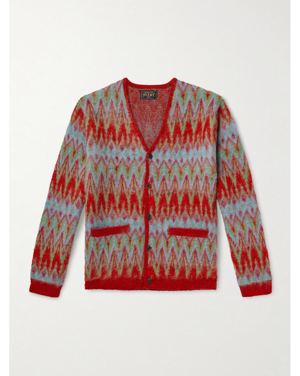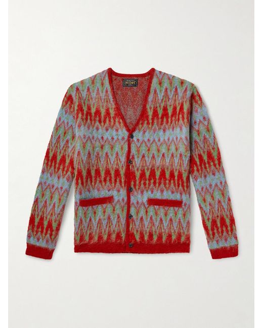 BEAMS PLUS' cardigan is jacquard-knitted with doubled chevron stripes, it's a little trippy, especially with the blurred, fuzzy texture. The yarn is blended with touches of wool and mohair. Colour: red