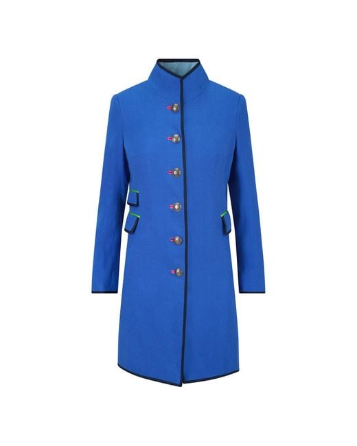 A ladies wardrobe is not complete without our Classic Nehru Jacket. Crafted from a beautiful quality linen, each jacket is elaborately detailed with satin bound button holes, contrasting pocket flap detailing and finished with a bold ribbon edge. Front closure is by six vintage style metal buttons with four smaller metal buttons to each cuff. The lightly padded shoulders and stand collar give a more formal feel, while the fitted long sleeves with optional turn back cuffs are lined with a contrast colour echoed inside on the front facing. The jacket if half lined making it the perfect multi seasonal jacket. Shell: 90% Linen, 10% Polyester Lining: 100% Polyester Trim: 100% Polyester Hand Wash, Drip Dry, Cool Iron. Do Not Tumble Dry Do Not Bleach Professional Dry Clean. Colour: blue