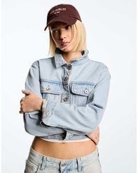 Denim jacket by Bershka Add-to-bag material Spread collar Press-stud placket Faux chest pockets Raw-cut hem Extremely cropped length Regular fit True to size. Cotton. Colour: blue
