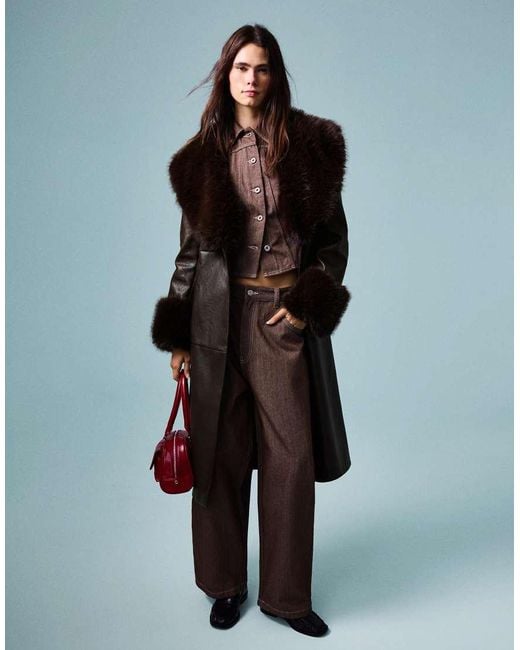 Women's Brown Leather Effect Coat With Contrast Faux Fur