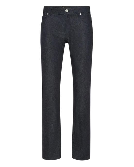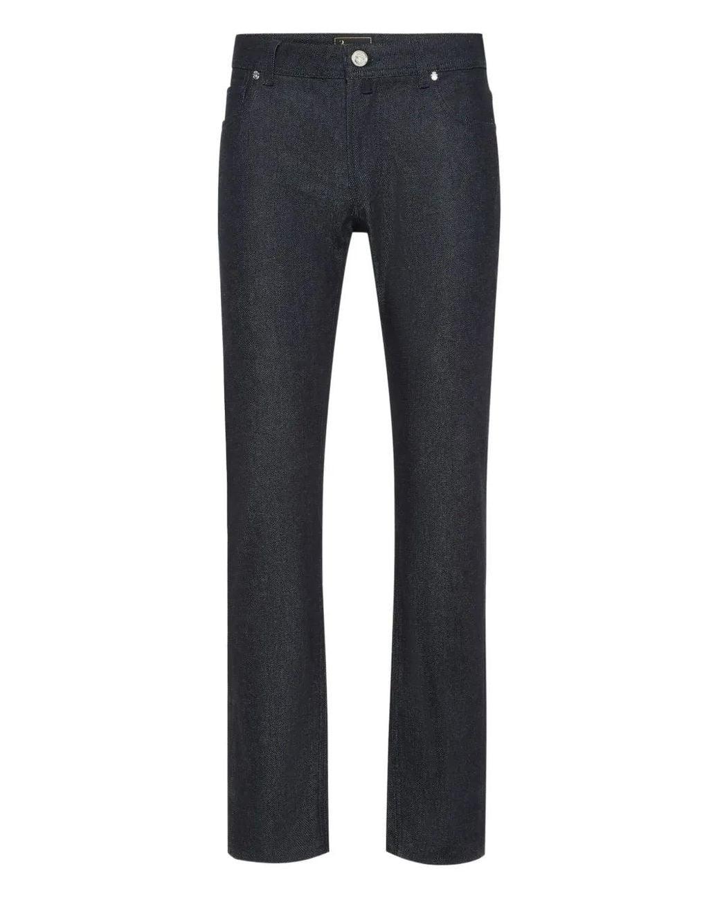 Dark blue five pockets straight-cut leg button fly logo patch tonal stitching Size: 30. Gender: Male. Material:Cotton/Elastane/Polyester/Cotton. Colour: blue