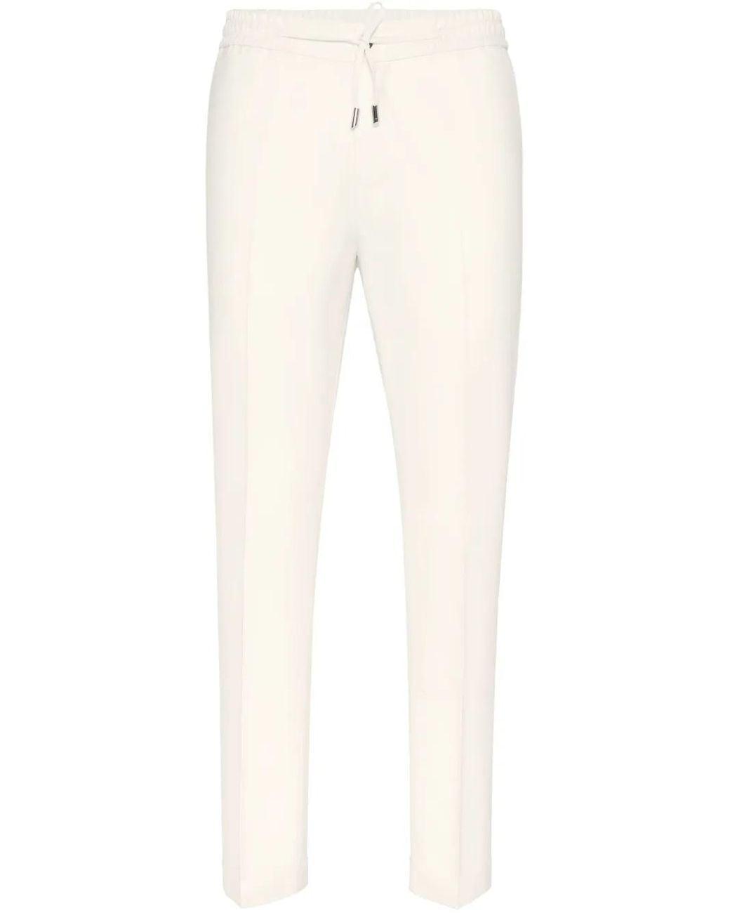 Light beige elasticated drawstring waistband two side slit pockets two rear jetted pockets pressed crease Size: 48. Gender: Male. Material:Virgin Wool/Cotton/Polyester. Colour: white