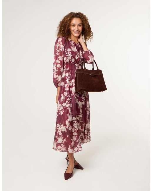 Women's Red Scoop Neck Floral Metallic Dress With Elasticated Waist