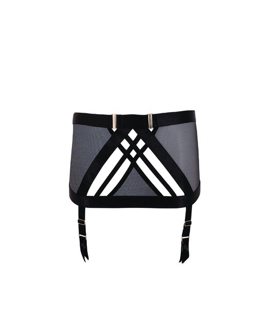 Create a dramatic silhouette with the Sawyer Skirt Suspender. Sheer mesh and directional banding combine to create a chic and contemporary piece, with adjustable suspender straps for the perfect fit. Wear with other items in the Sawyer collection for a modern take on a classic look. Colour: black