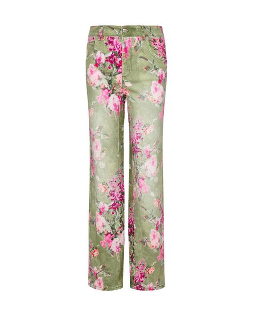 Green printed casual trousers, floral prints, buttons and zippers. Colour: multicolour