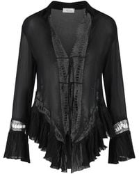 Go to YOOXBLUMARINE. crepe, denim effect, no appliqués, tie-dyed, v-neck, long sleeves, 1 button, tie fastening, without pockets, do not dry clean, do not bleach, do not tumble dry, ruched shirt, this brand runs small. 100% Silk. Colour: black
