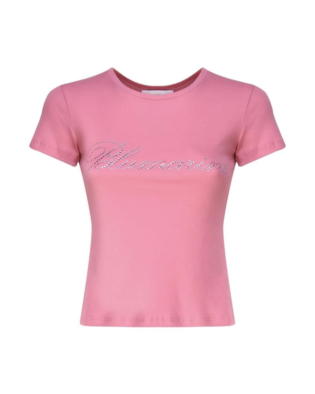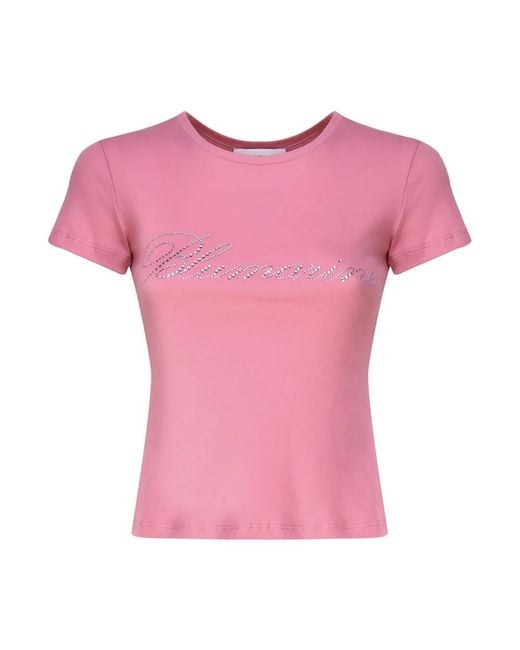 Blumarine Logo Cotton T-Shirt is a slim‑silhouette tee by Blumarine that features a rhinestone‑embellished logo for a refined casual look. Key attributes: Pink | Cotton | Round neckline | Rhinestone‑embellished logo on front | Slim silhouette | Made in Italy | Dimensions & fit: Slim fit | Composition & care: 100% Cotton