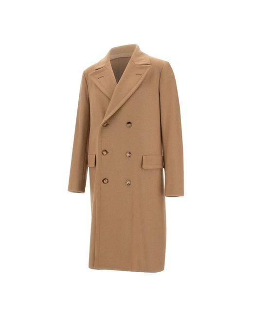 Boglioli Wool Double-Breasted Coat blends tailored structure with refined detailing, making it a versatile choice for smart outerwear. The double-breasted front and distinctive half-belt back give it a polished, finished silhouette. Key attributes: Camel | Brown | Wool blend | Double-breasted closure with logo buttons | Front flap pockets | Inside pockets | Viscose lining | Wide peak lapels | Centre back pleat | Half-belt (back martingale) | Logo buttons | Front flap pockets | Dimensions & fit: Regular fit | Composition & care: Wool blend | Viscose lining | Dry clean Colour: brown