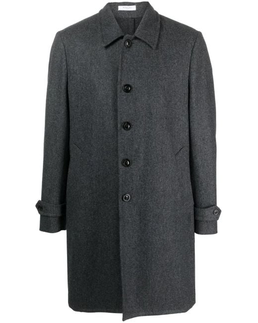 Dark grey wool classic collar front button fastening long sleeves two side inset pockets straight hem above-knee length central rear vent Size: 52. Gender: Male. Material:Viscose/Wool.