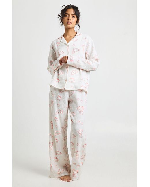 - Breakfast Print Textured Long Sleeve Shirt & Trouser Pyjama 3 Piece Set