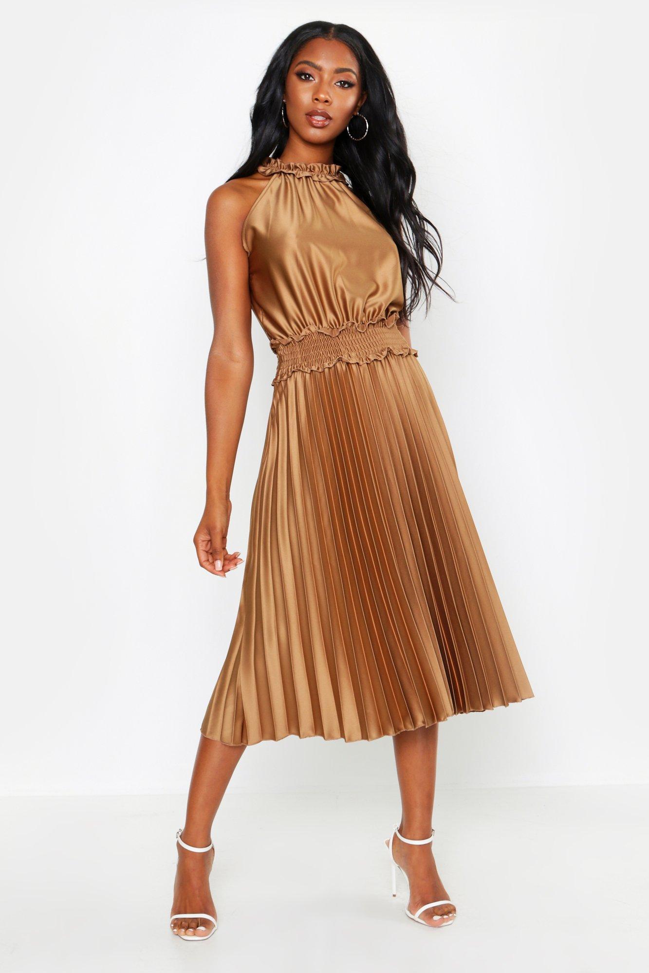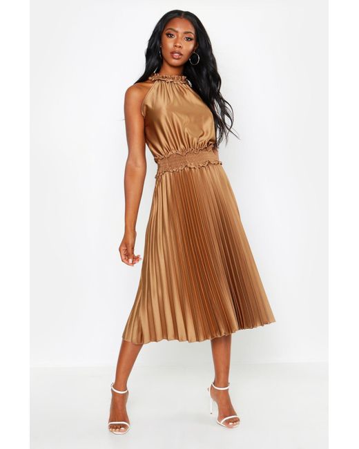 Women's Brown Shirred Waist Pleated Midi Dress