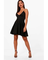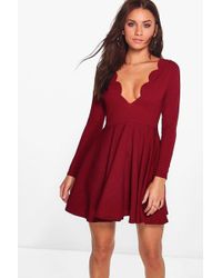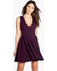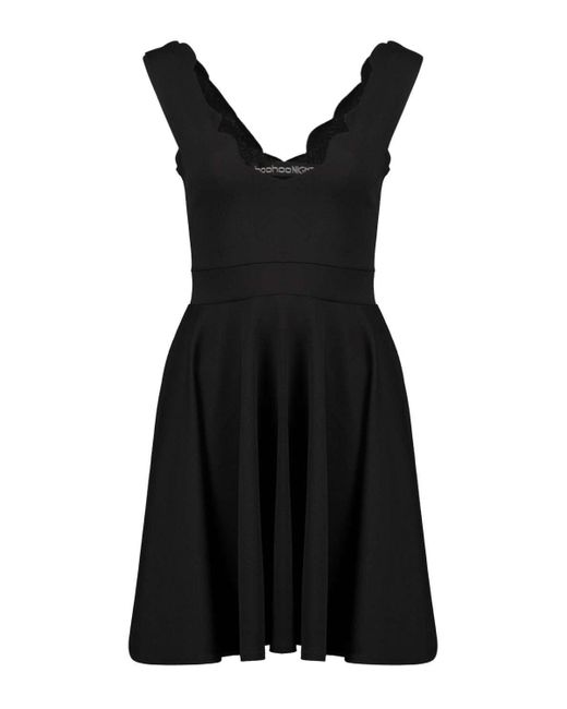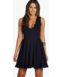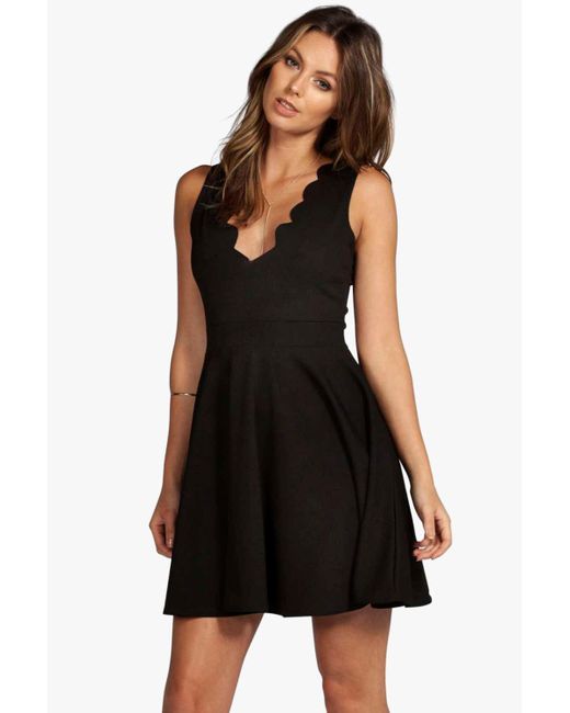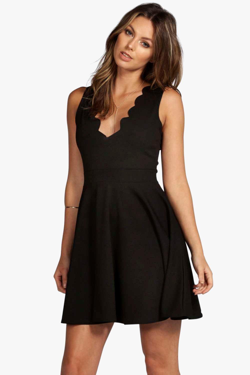 Earn your style-queen status and add this scallop-detail plunge skater dress to your collection. Sleeveless with a scallop-detail plunge neck and flared skirt, this mini dress is a true go-to for nights out with the squad but also doubles up as a daywear staple with a cute satchel and flat sandals. 95% polyester, 5% elastane. Flat measurement of garment: shoulder to hem 85cm/33", bust 36cm/15", waist 32cm/12.5", hip 41cm/16". Machine washable. Model wears uk size 10. Colour: black