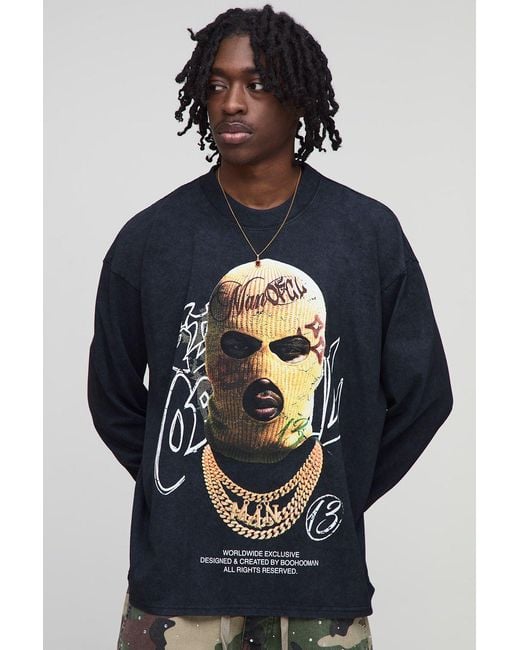 - Oversized Extended Neck Ski Mask Long Sleeve Printed Washed T-Shirt