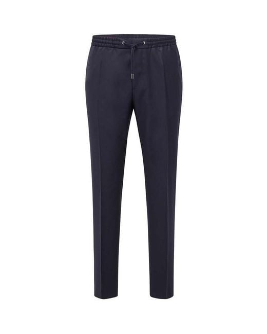 Mens BOSS Banks Trousers in dark blue. - Elasticated drawcord waist. - Button and zip closure. - French pocket. - Jet pocket. - Serge-woven wool. - Slim fit. - Main material: 100% Virgin wool Lining: 100% Viscose. Dry clean only. - Ref: 50403896401 Colour: blue