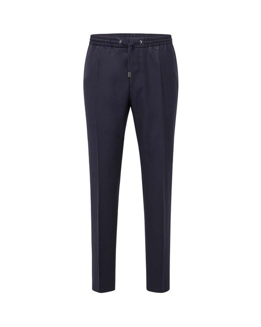 Mens BOSS Banks Trousers in dark blue. * Elasticated drawcord waist. * Button and zip closure. * French pocket. * Jet pocket. * Serge-woven wool. * Slim fit. * Main material: 100% Virgin wool Lining: 100% Viscose. Dry clean only. * Ref: 50403896401 Colour: blue