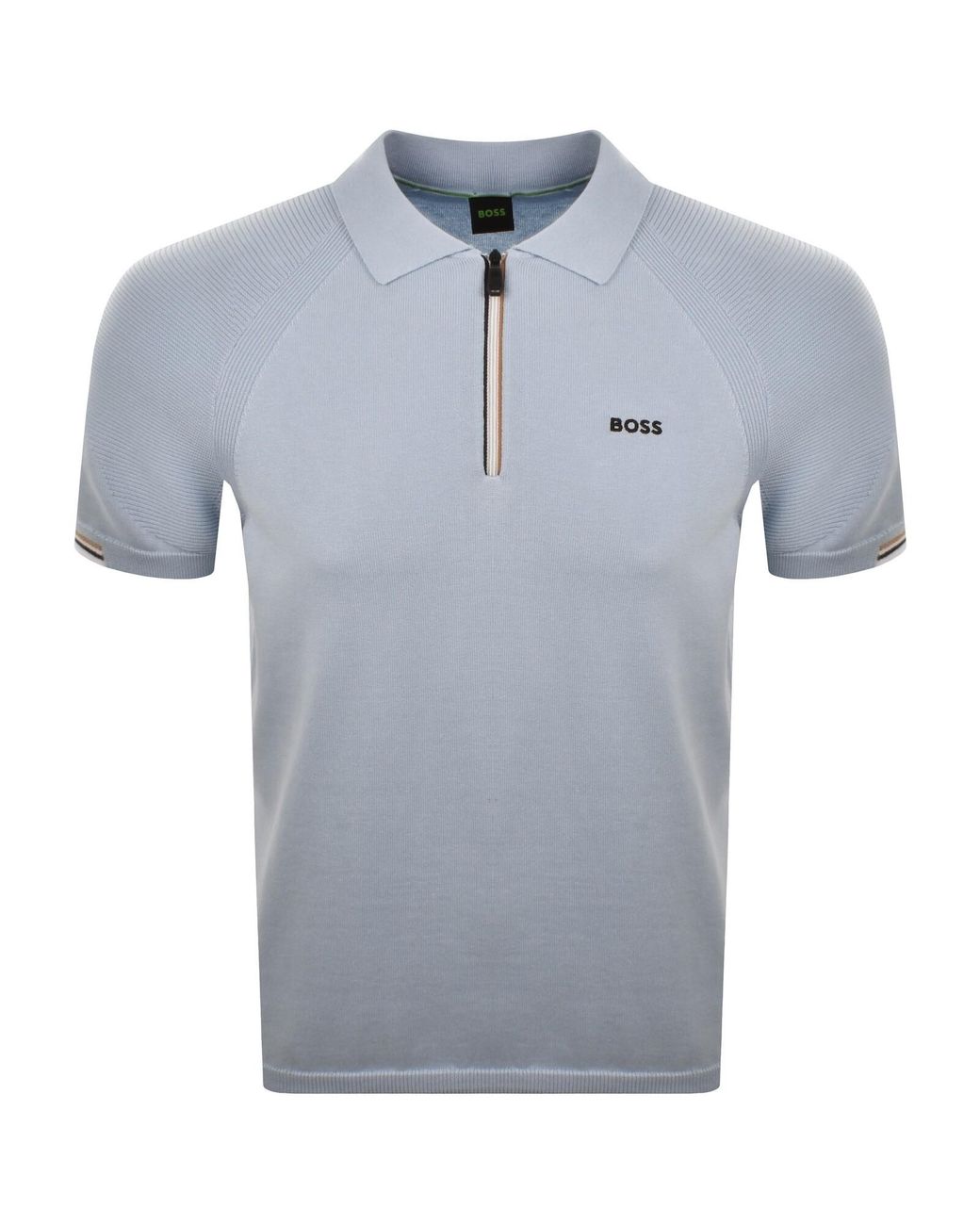 BOSS GOC Perform Knit Polo In Open Blue. An all over knit design with a quarter zip fastening and polo collar ribbed sleeve cuffs and a ribbed waistband. Textured panels feature on the short sleeves with perforated details underarms. The BOSS logo is situated on the left of the chest. Beige white and black stripe detailing on the placket and sleeve cuffs. 50% Lyocell and 50% Cotton Colour: blue