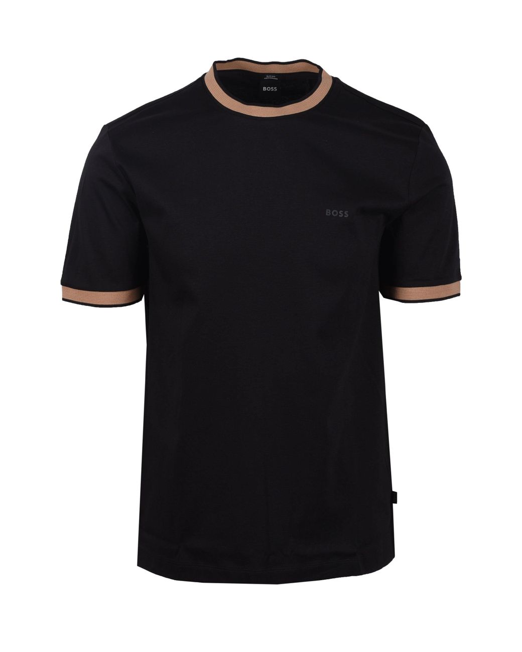 Boss Black H-Tessler T-Shirt in Black Introducing the BOSS H-Tessler T-Shirt in Black, a sophisticated wardrobe staple. This slim-fit t-shirt is made of 100% mercerised cotton for a soft feel and a subtle sheen. It has a striking brown ribbed crew neck with detailed white stitching for contrast and detail. This t-shirt is designed for comfort and style, with a characteristic BOSS woven logo pinch tag on the lower left side seam, side vents at the hem, and inside reinforcing tape for added durability. The H-Tessler T-shirt is ideal for both casual and smart-casual ensembles, combining classic style with mindful details. Features Slim Fit Design: Offers a modern, tailored silhouette. Mercerised Cotton: Provides a smooth texture and a refined finish. Contrasting Ribbed Crew Neck: Features a unique brown collar with white stitch detailing. BOSS Logo Tag: Signature woven logo pinch tag on the lower left side seam. Reinforced Side Vents: Hem vents with interior reinforcement tape for durability. Short Sleeves: Classic short-sleeve design for versatile wear. 100% Cotton: Ensures breathability and comfort. Style: 50543858 Colour: black