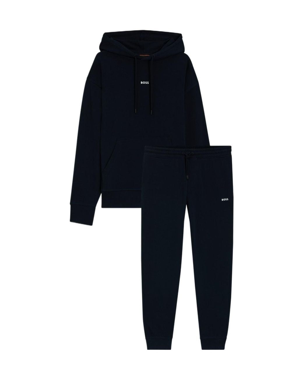 Sweatshirt, hooded, long sleeves, trousers, contrasting logo details, hem cuffs. Colour: blue
